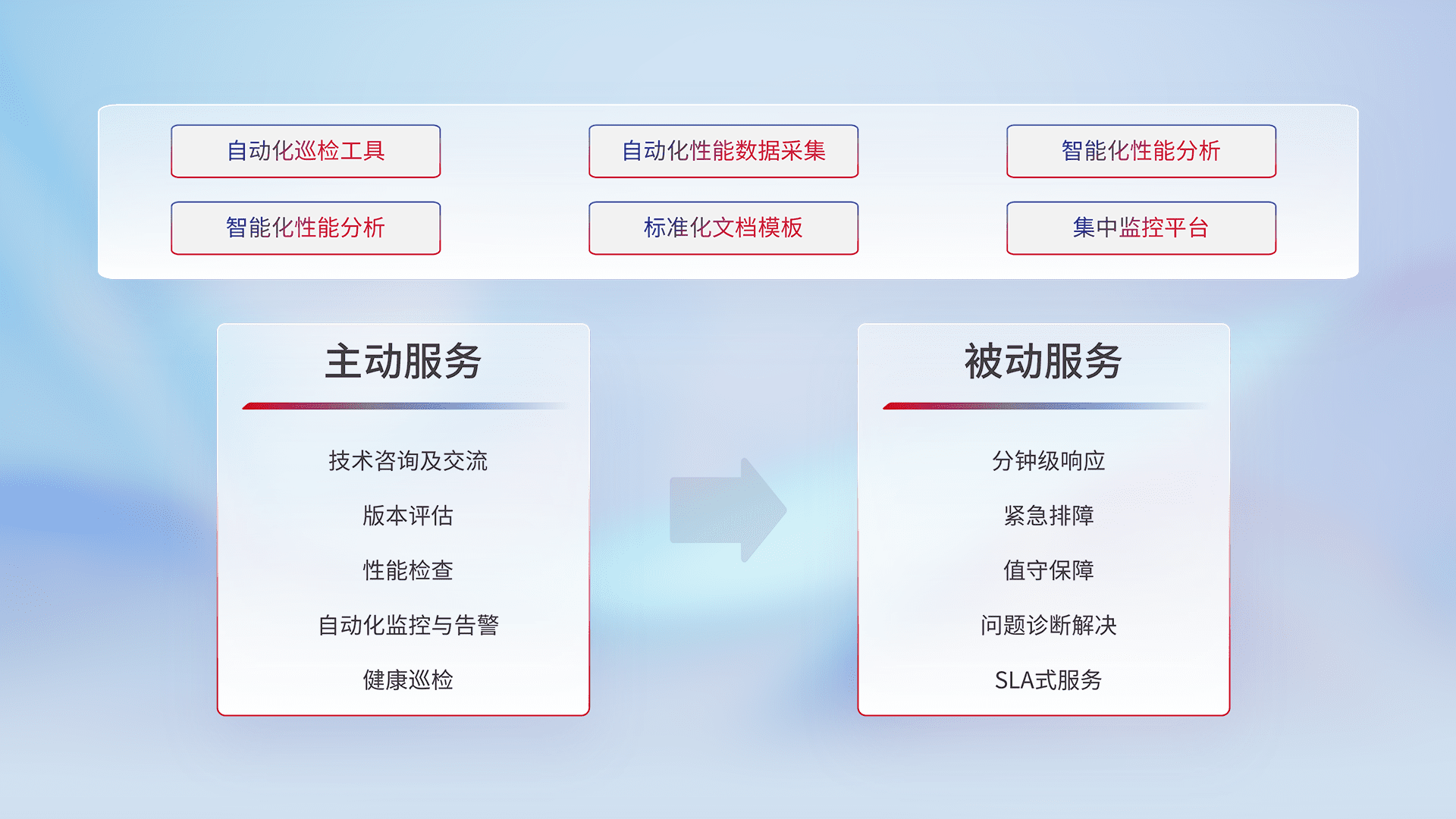 智能化工具和标准化文档,,保障服务质量,,,提供主动服务(包含技术咨询、、、、版本评估、、、、性能检查、、、、自动化监控与告警、、、健康巡检)和被动服务包含(分钟级响应、、、、紧急排障、、值守保障、、问题诊断解决、、、、SLA服务)。。